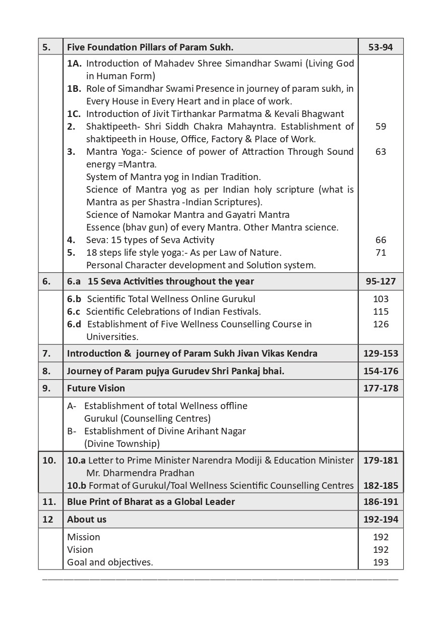 5) Spiritual Sadhna. All these activities are established systematically after the establishment of the Trust. The Sevak team was created to conduct all these activities. All the future visions of P.Pujya Gurudev Pankajbhai will be henceforth implemented through Param sukh jivan Vikas Kendra. He has also expressed that before he leaves this physical body he will successfully motivate 36 crore families to join PARAM ANAND PARIVAR who will follow the path of SIMANDHARSWAMI ( MAHAVIDEH KSHETRA).